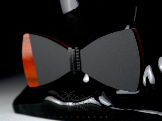 'Dendro' is a collection of wooden bowties, featuring intricate wood-patterned acrylics.