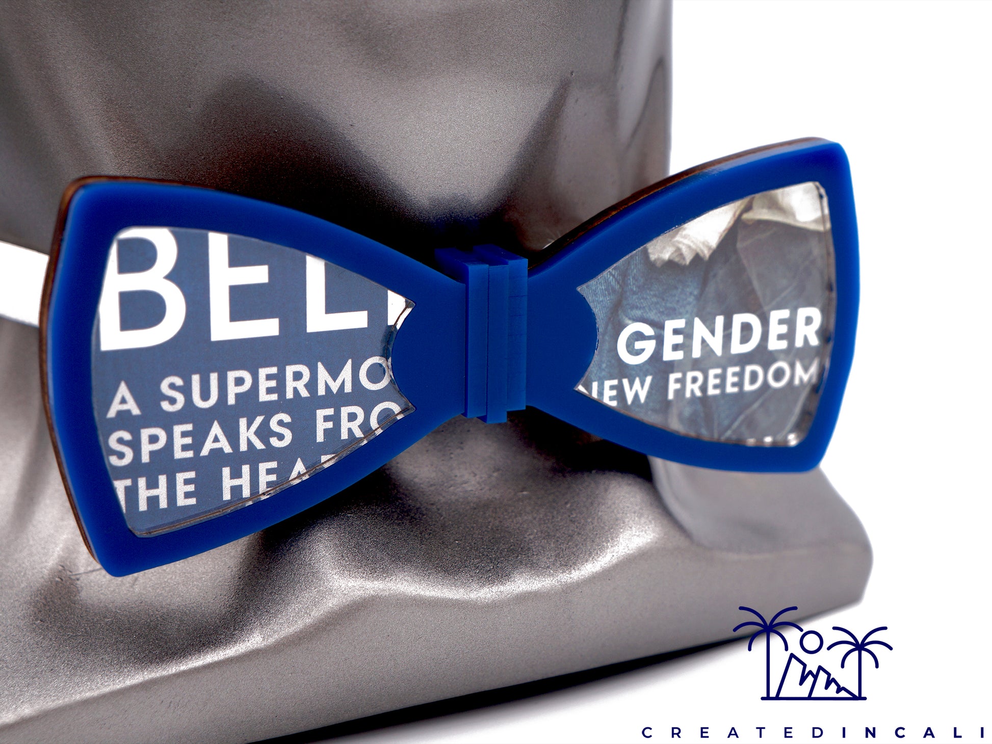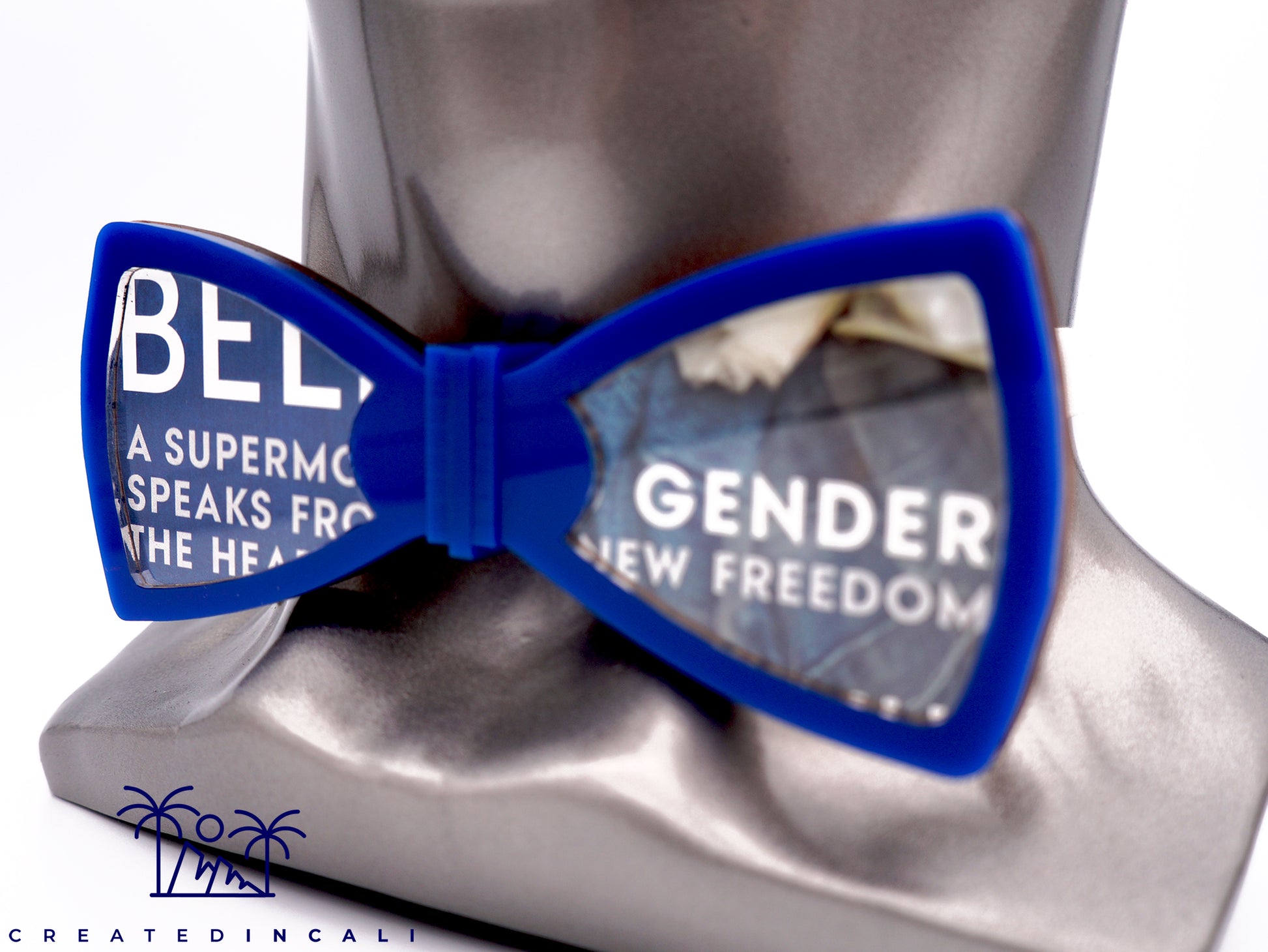 This bowtie features a glossy blue border with clear inlays, allowing the magazine cover fragments to shine through, creating a captivating visual effect.