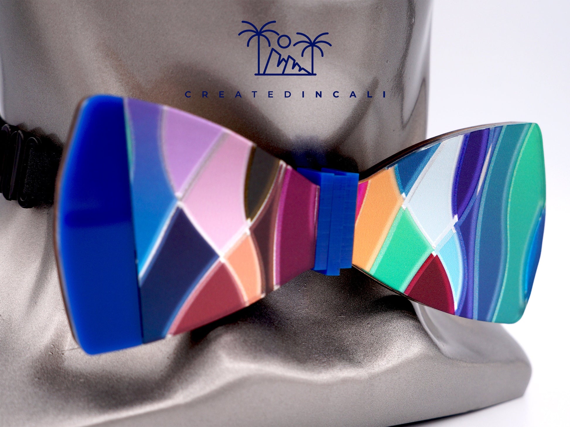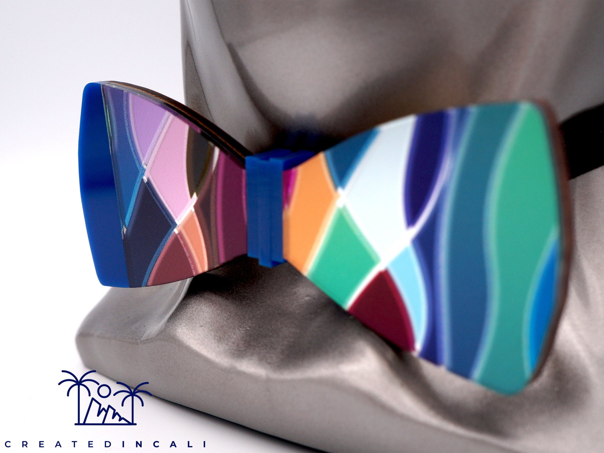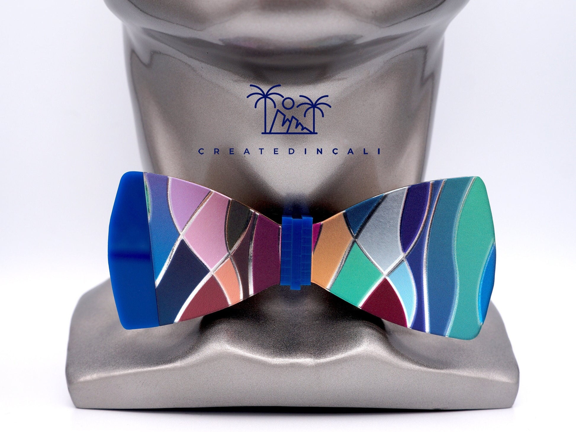 This bowtie features a captivating acrylic design that resembles a colorful stained glass window, creating a vibrant and unique look for each one.