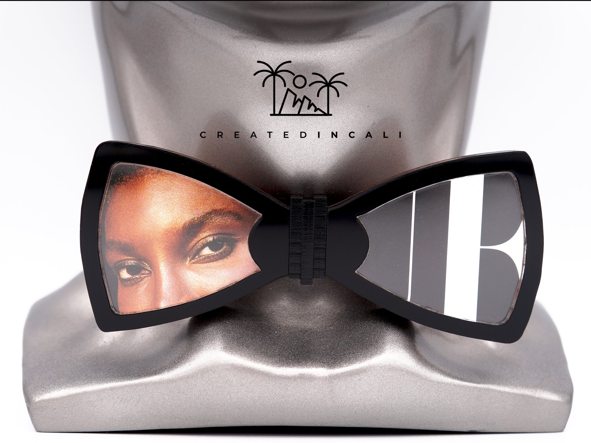 This bowtie features a glossy black border with clear inlays, allowing the magazine cover fragments to shine through, creating a captivating visual effect.