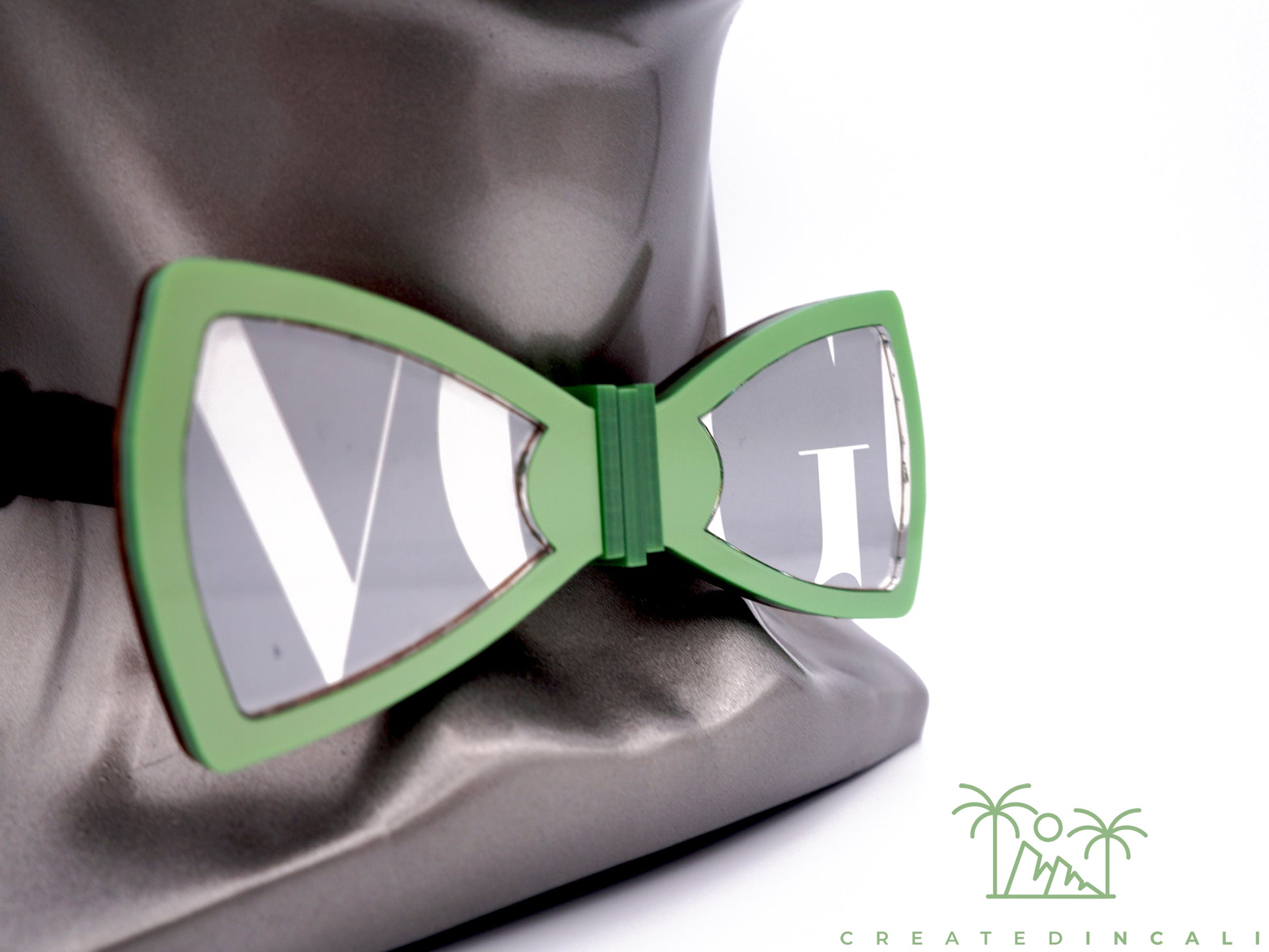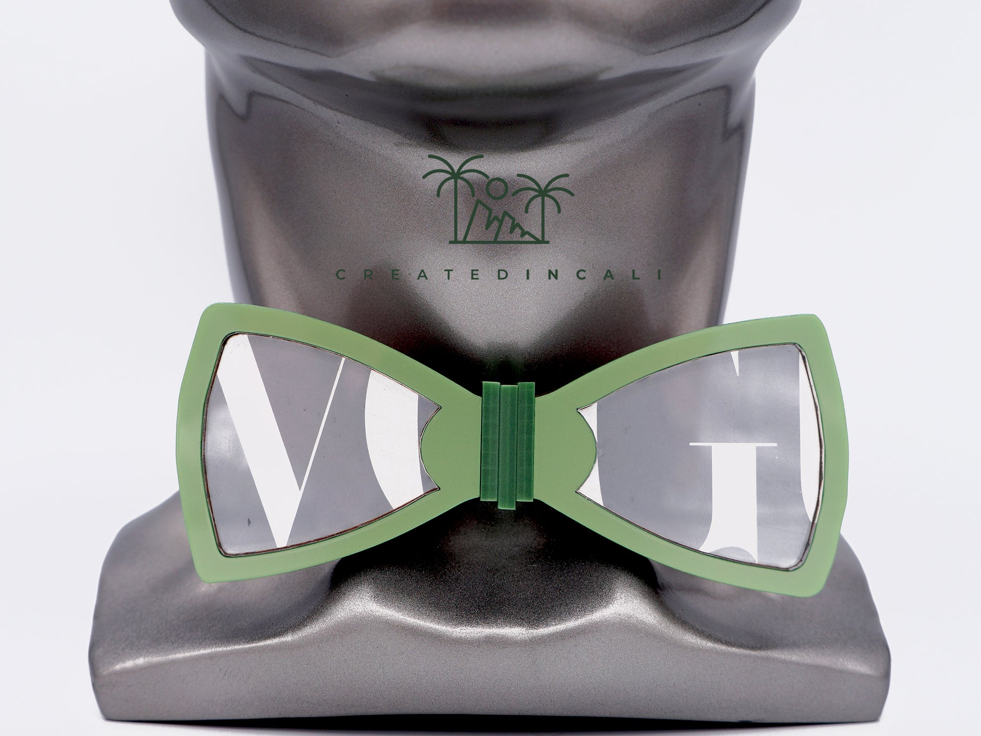 This bowtie features a sage green border with clear inlays, allowing the magazine cover fragments to shine through, creating a captivating visual effect.