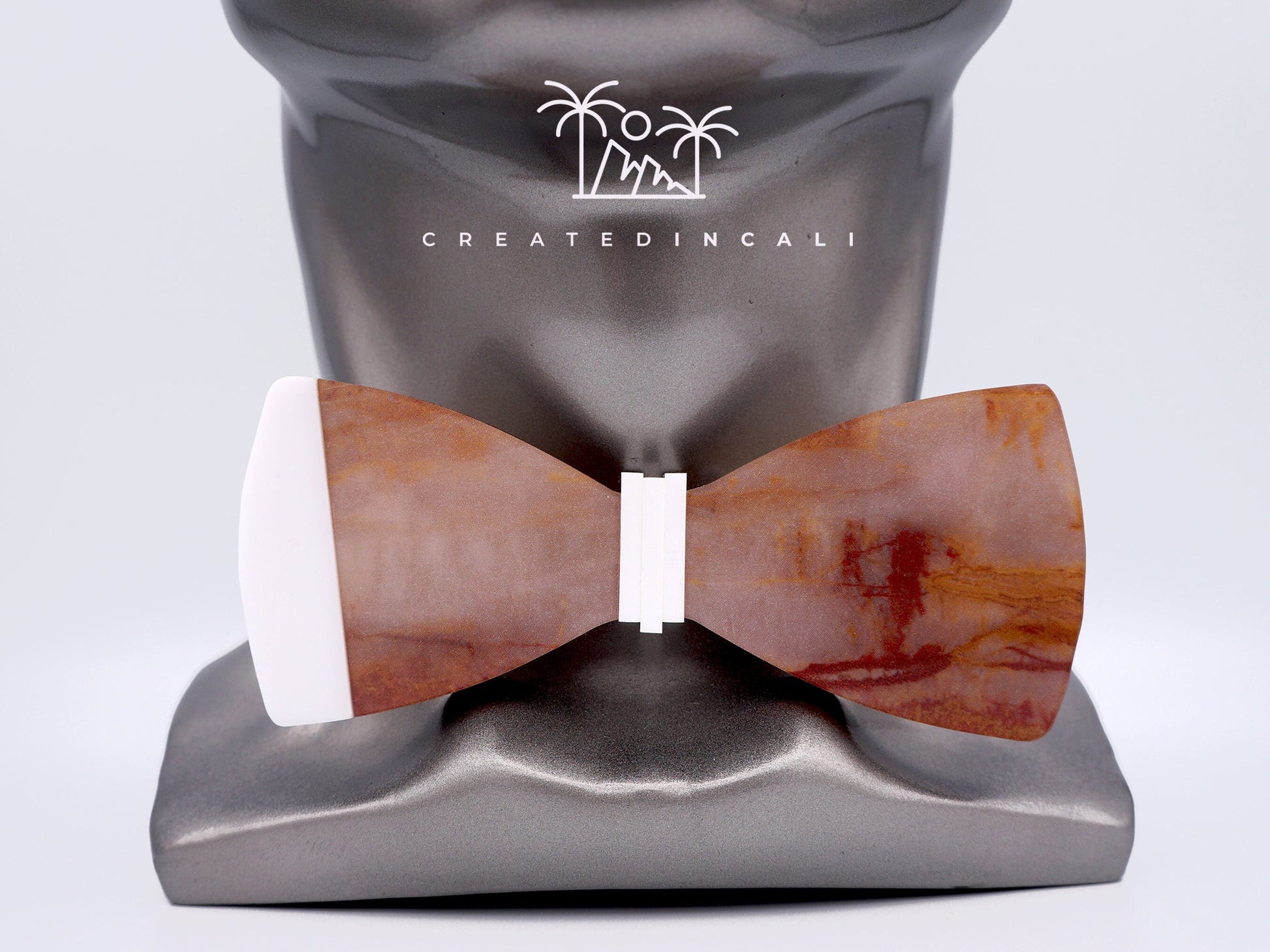 Crafted with precision, this bowtie boasts a wooden base adorned with a stunning Breccia Pernice marble pattern.