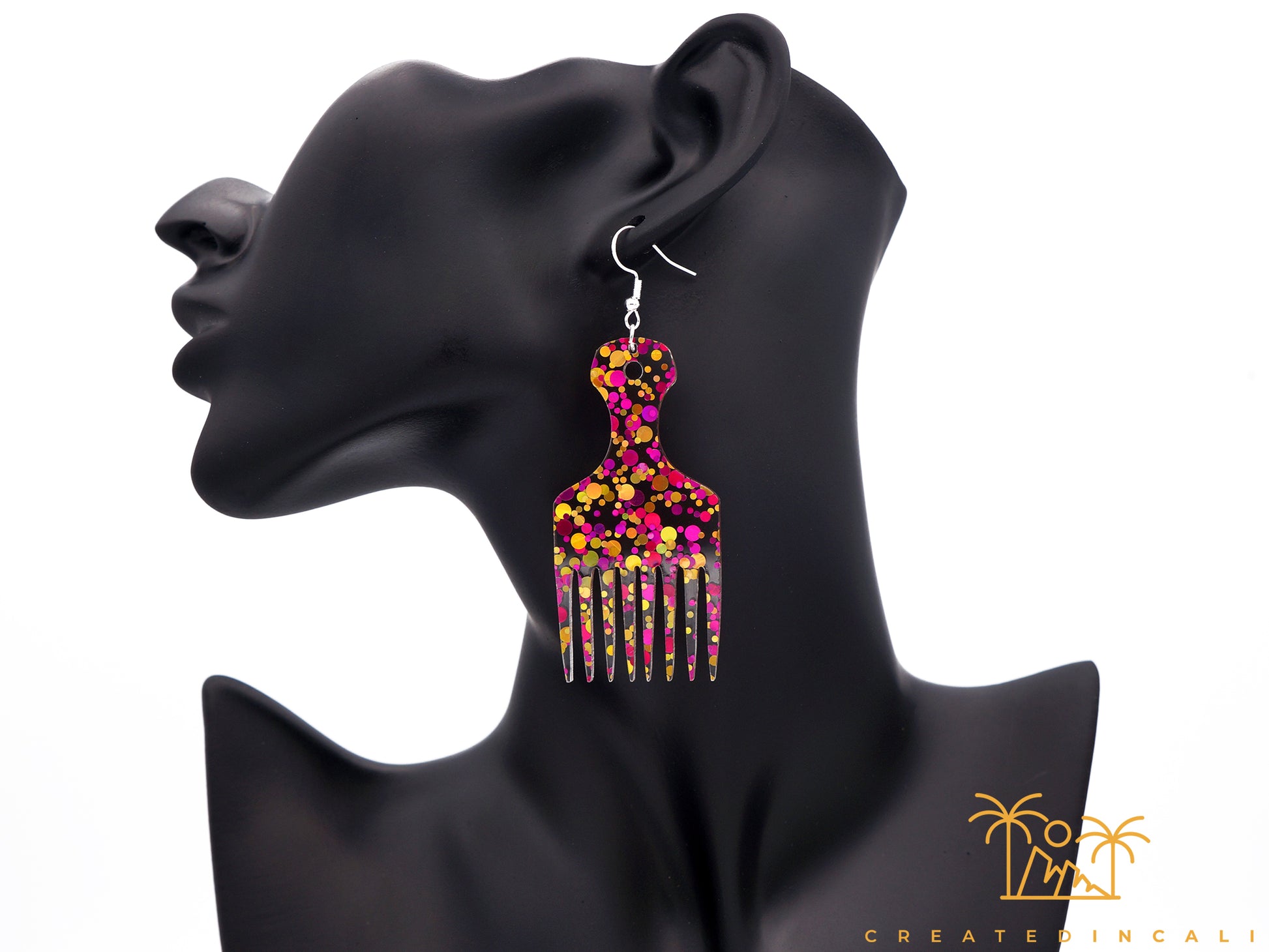 Introducing our stylish and unique hair pick-shaped earrings in Pink and Yellow Glitz!