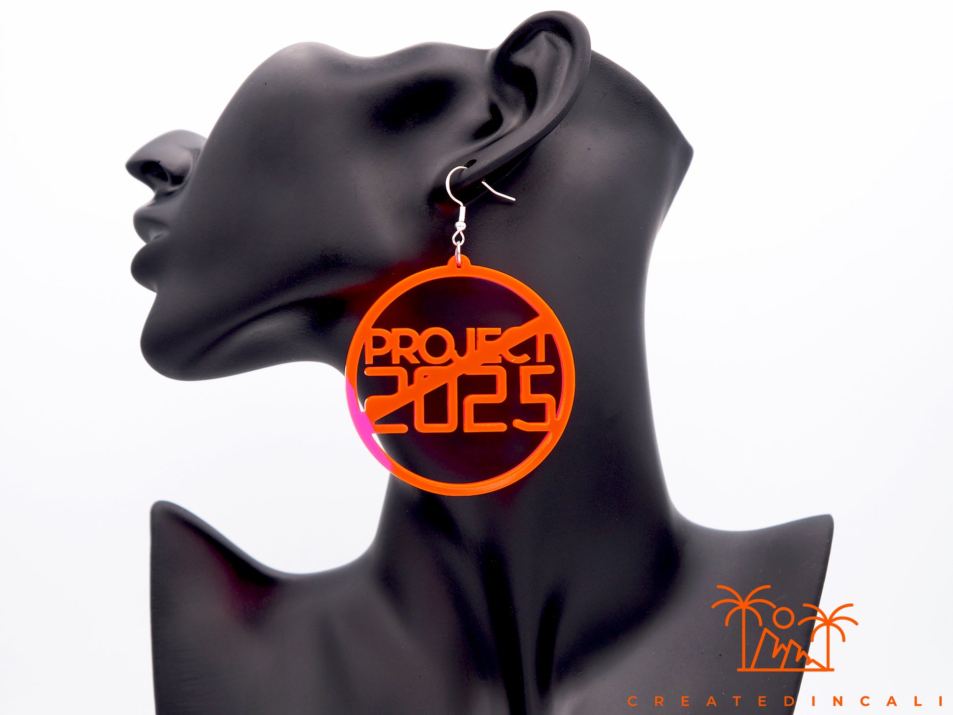Each earring features a round pendant measuring approximately 2.3 inches, with a slash through the center and the words "Project 2025."