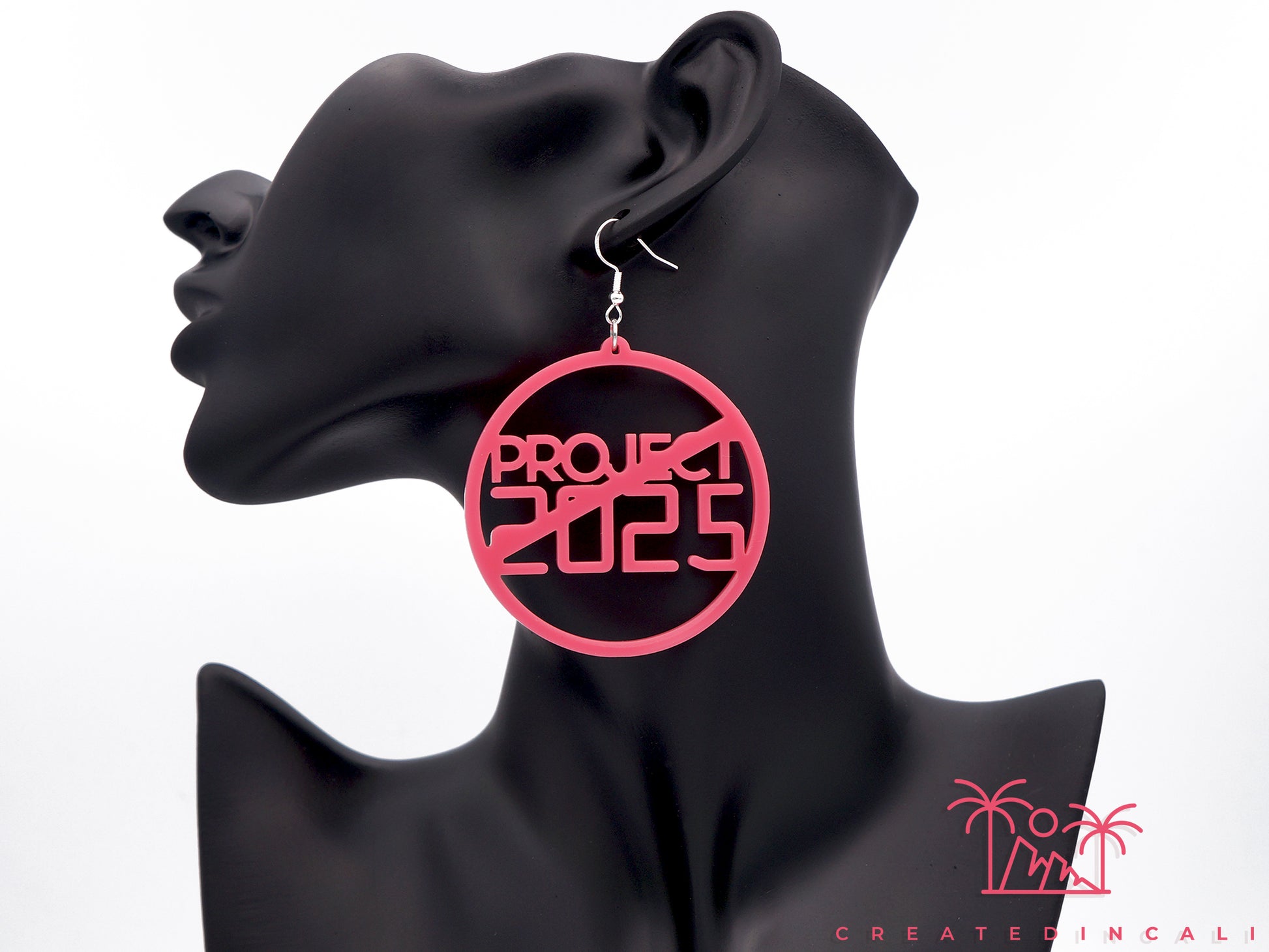 Each earring features a round pendant measuring approximately 2.3 inches, with a slash through the center and the words "Project 2025."