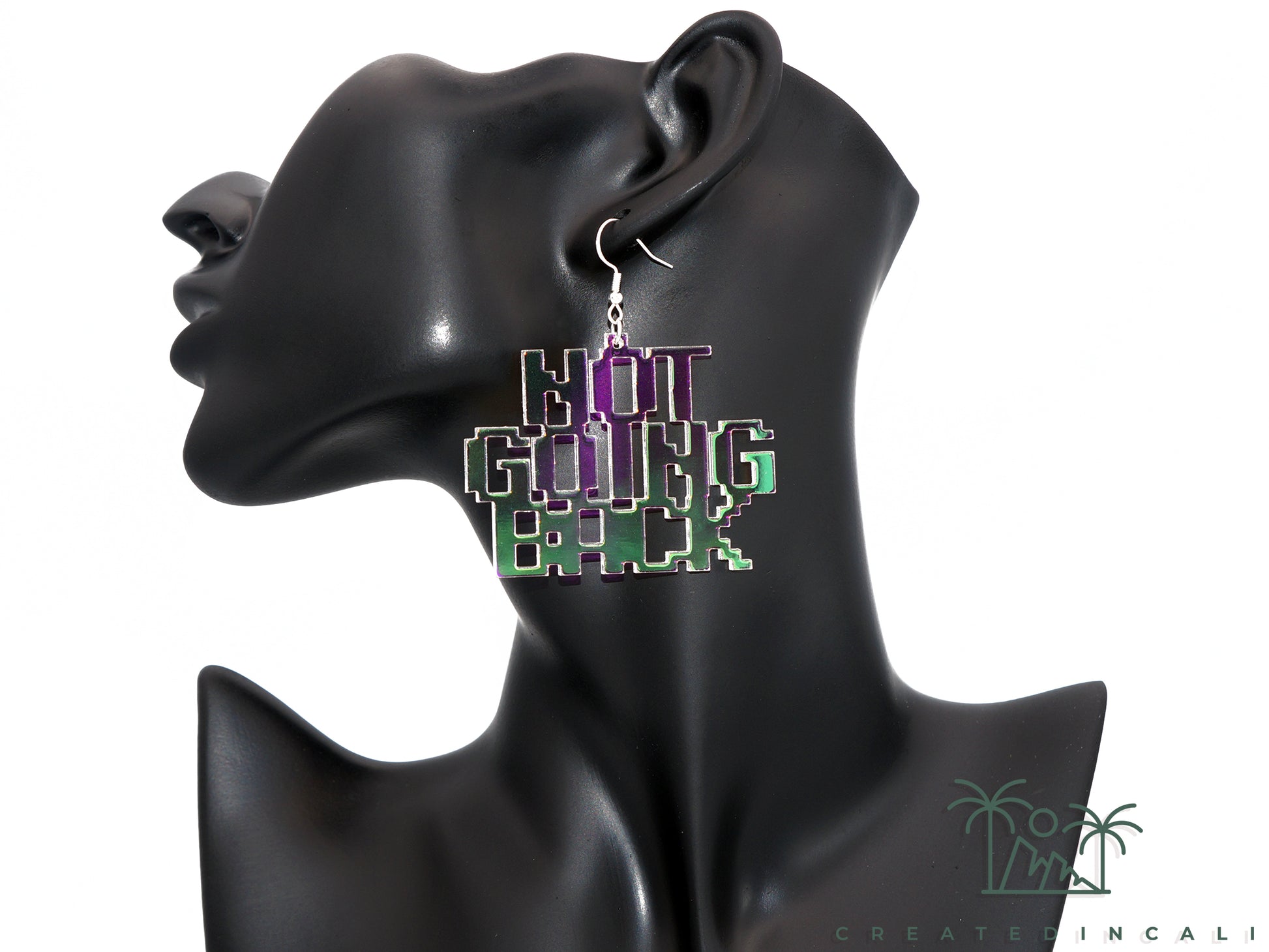 Each earring features a pendant measuring approximately 1.75 inches tall and 2.25 inches wide, with the words "NOT GOING BACK."
