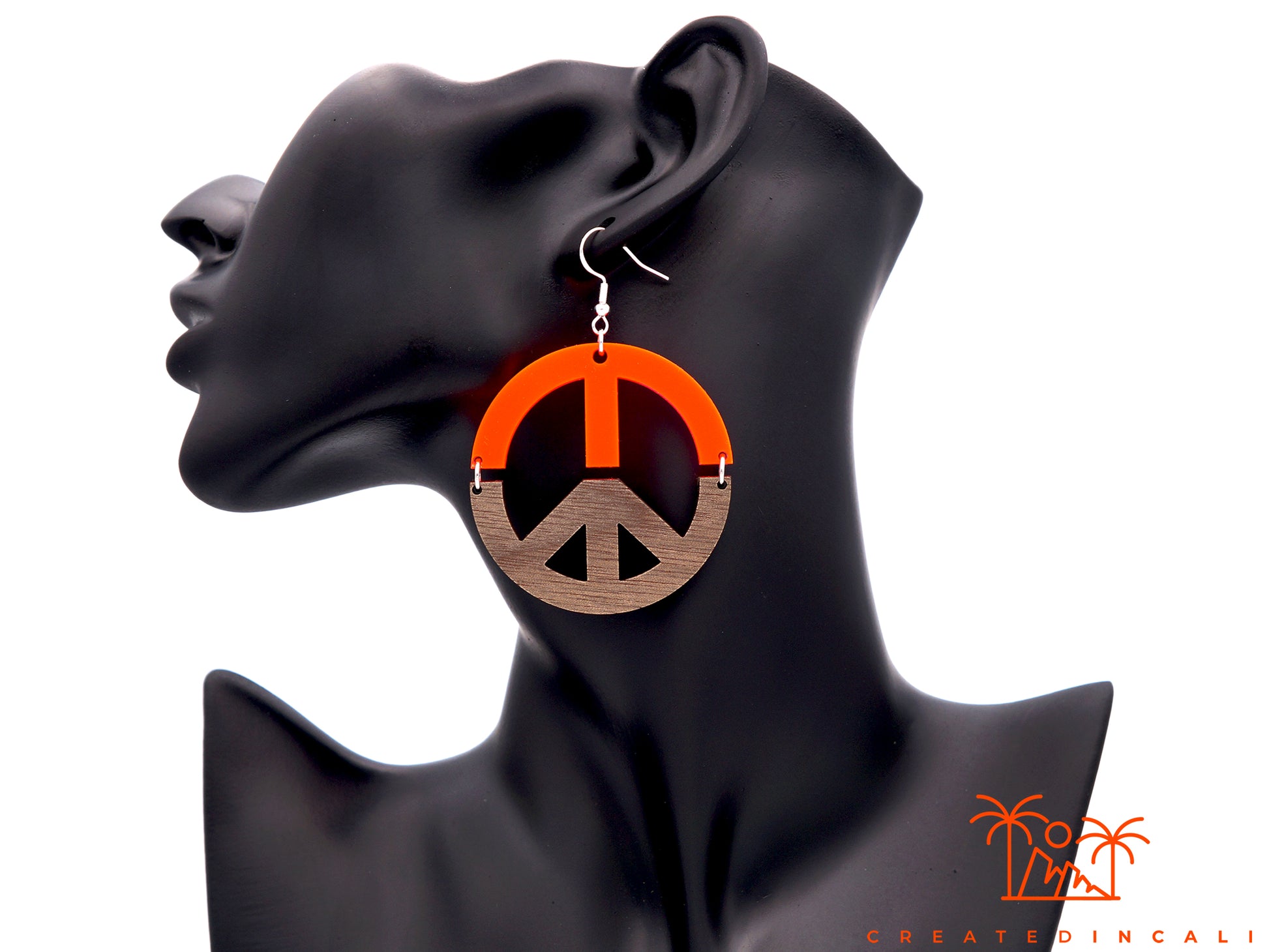 Fluorescent Pink/Walnut Peace Symbol Earring set – a stylish accessory that effortlessly marries the warmth of walnut wood with the boldness of fluorescent pink acrylic. These earrings seamlessly blend natural elements with contemporary design.