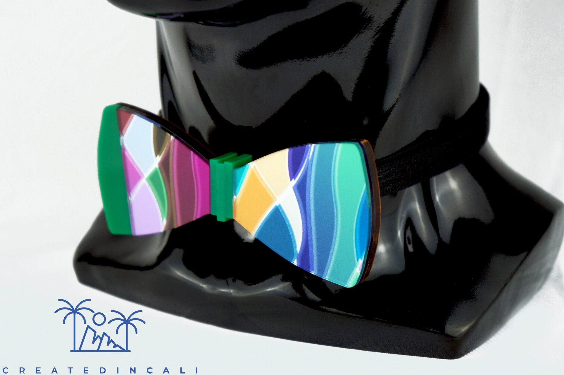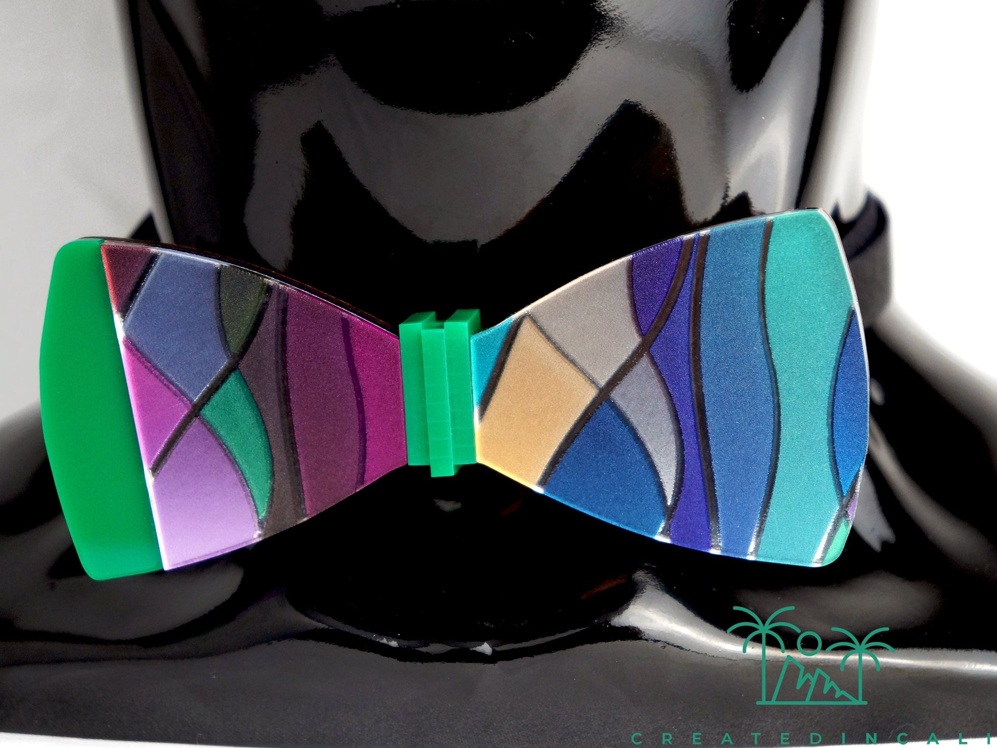 This bowtie features a captivating acrylic design that resembles a colorful stained glass window, creating a vibrant and unique look for each one.