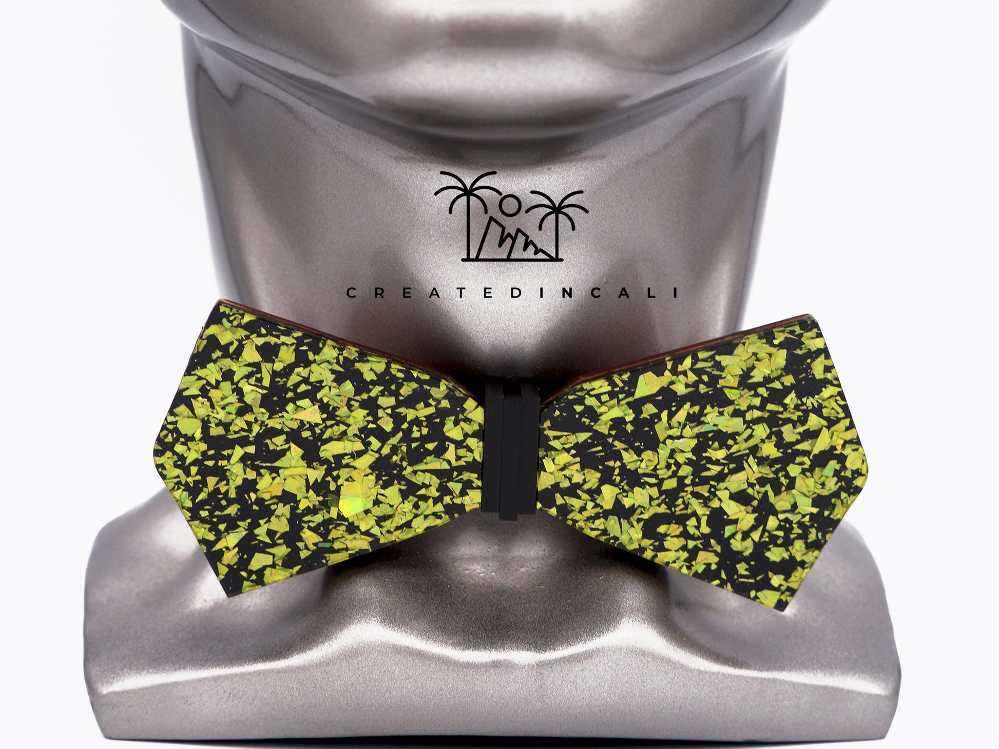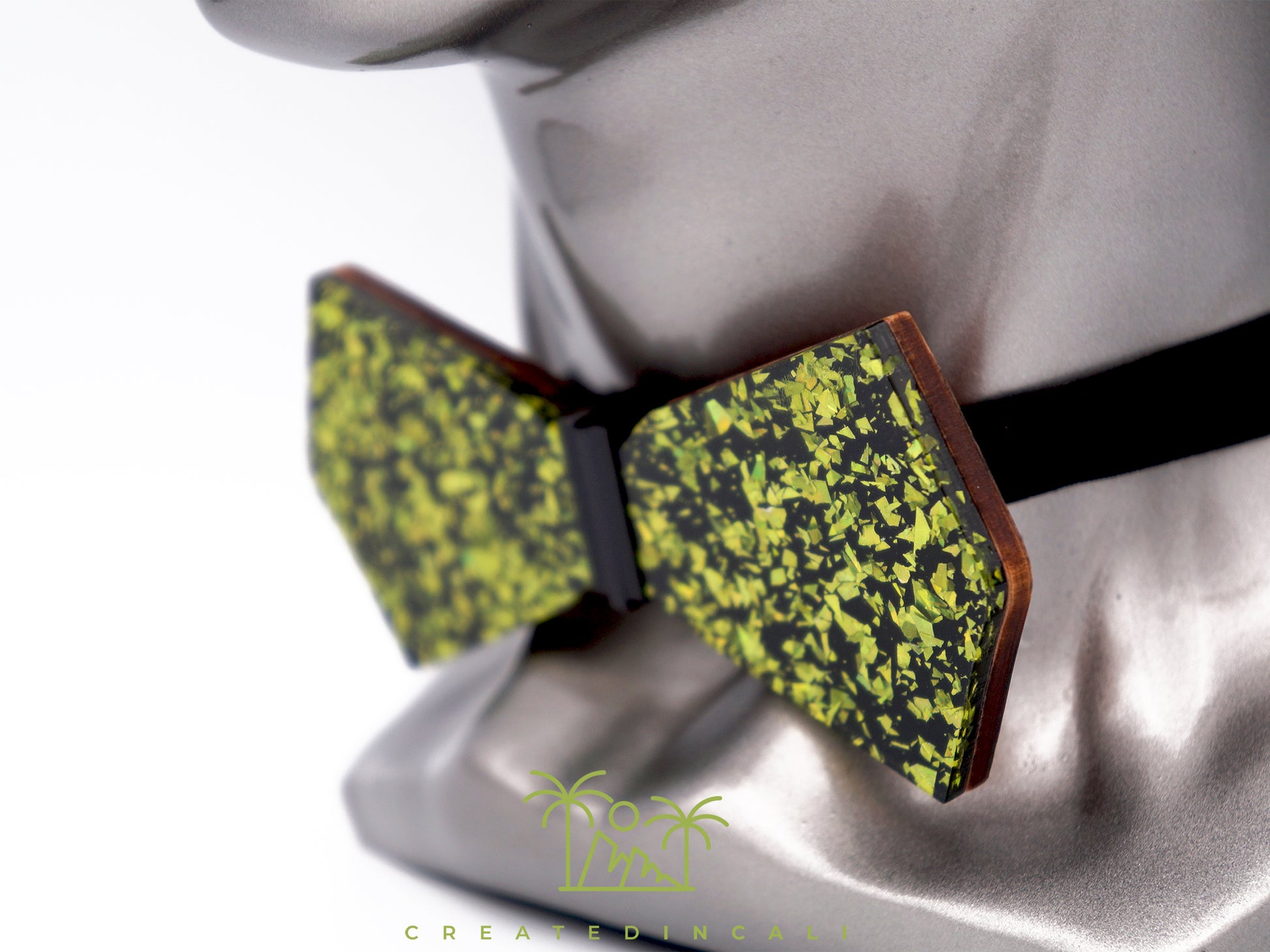 Handcrafted with meticulous precision, this bowtie boasts a sleek black surface adorned with radiant green flakes, ensuring you stand out in any crowd.