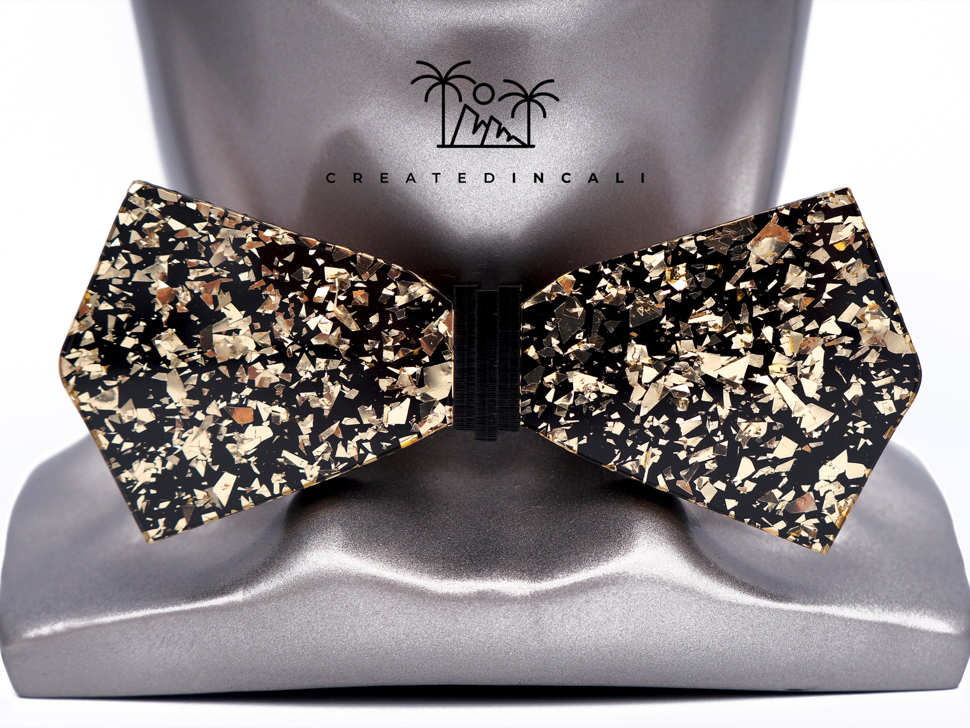 Handcrafted with meticulous precision, this bowtie boasts a sleek black surface adorned with radiant gold flakes, ensuring you stand out in any crowd.