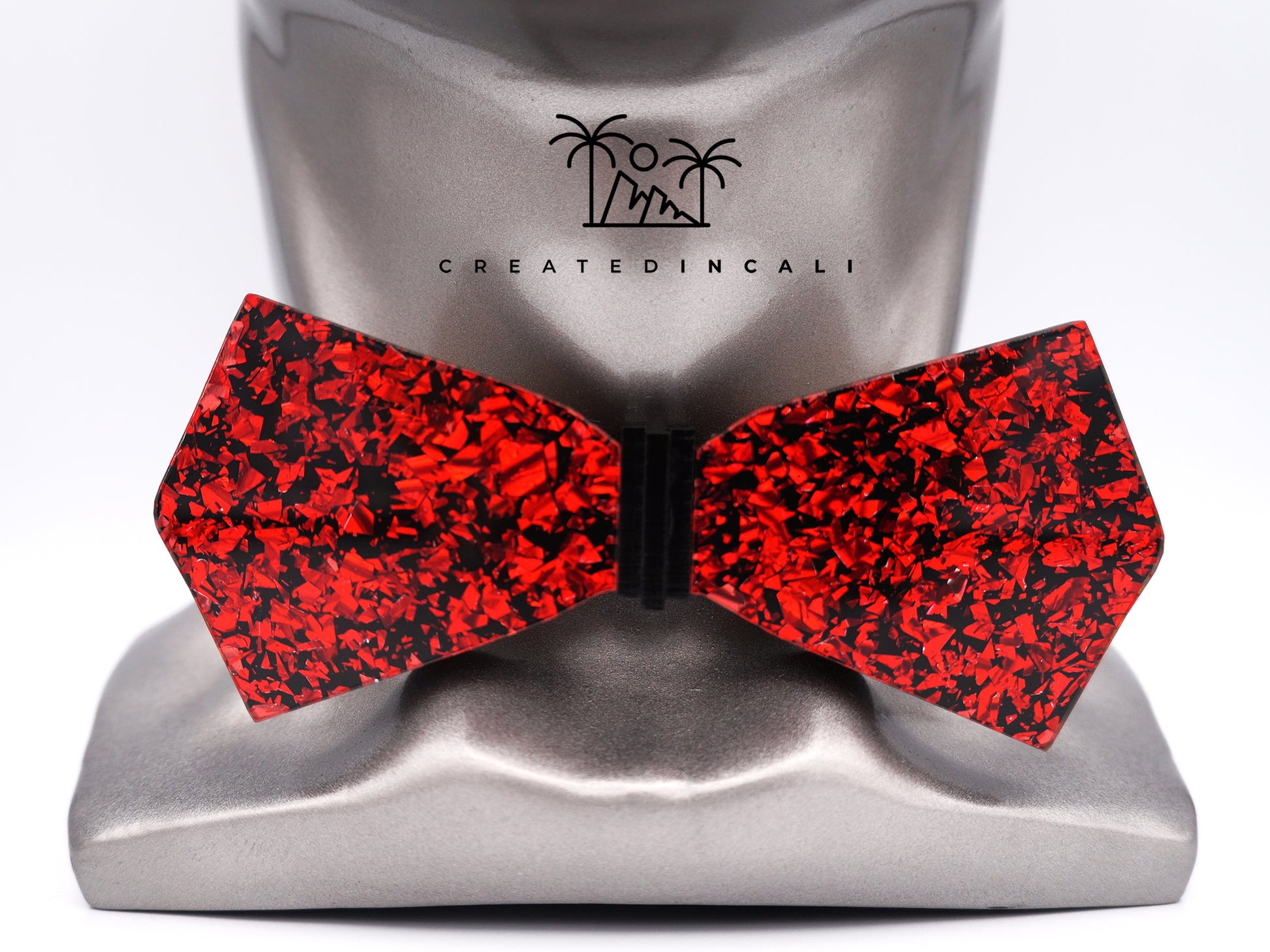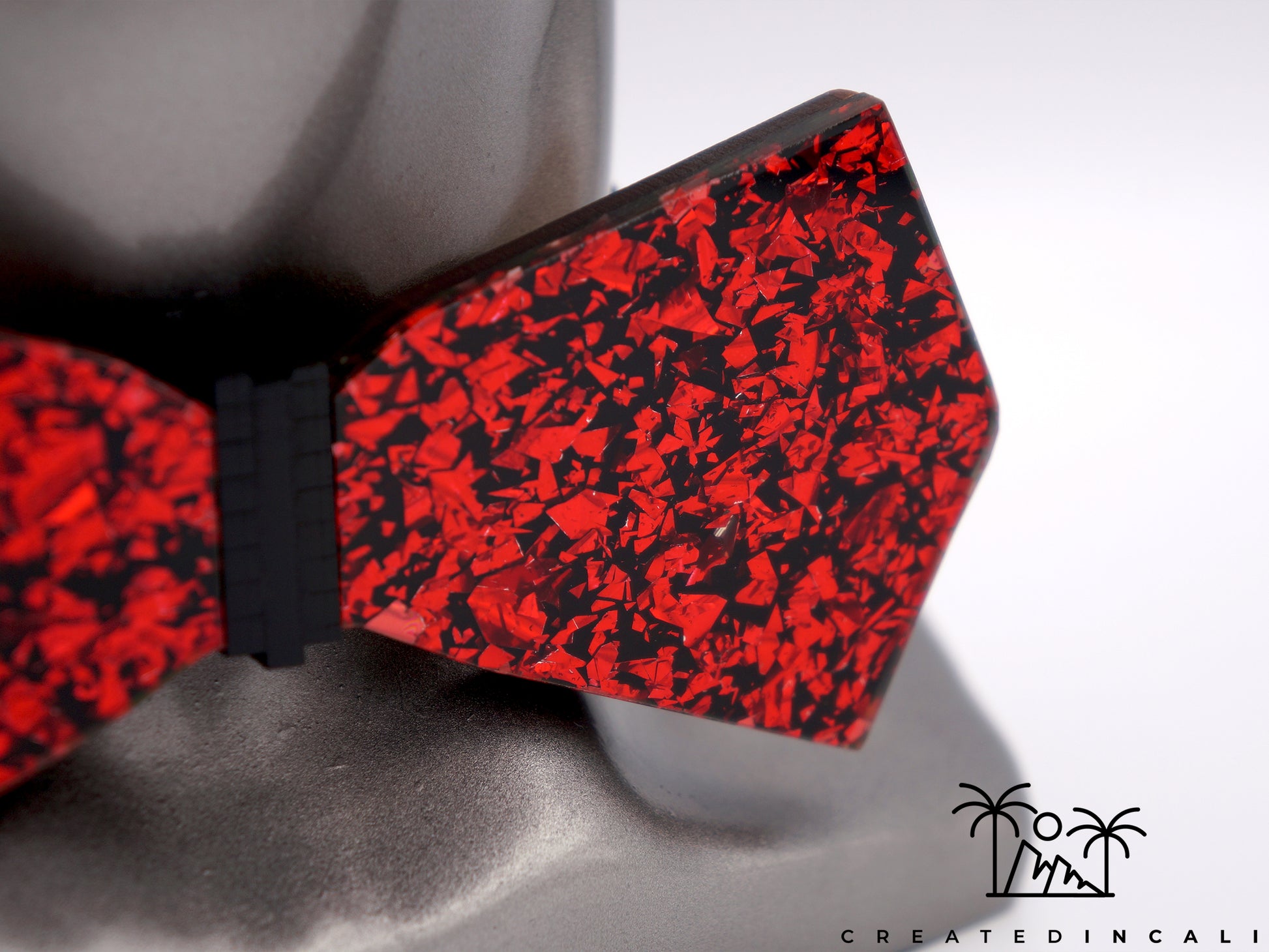 Handcrafted with meticulous precision, this bowtie boasts a sleek black surface adorned with radiant red flakes, ensuring you stand out in any crowd.