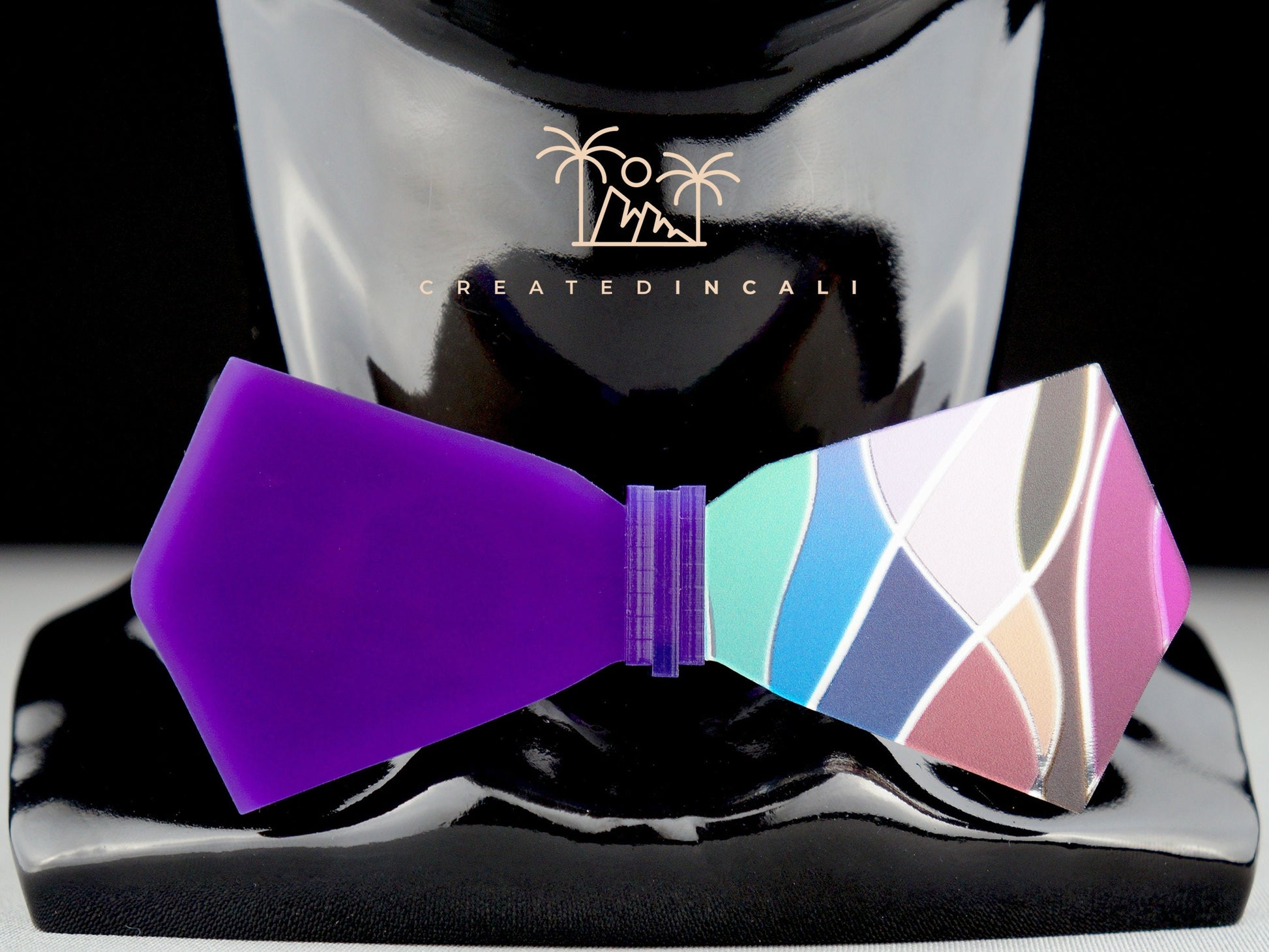 This bowtie showcases a captivating acrylic design, reminiscent of a stained glass window, on one half.