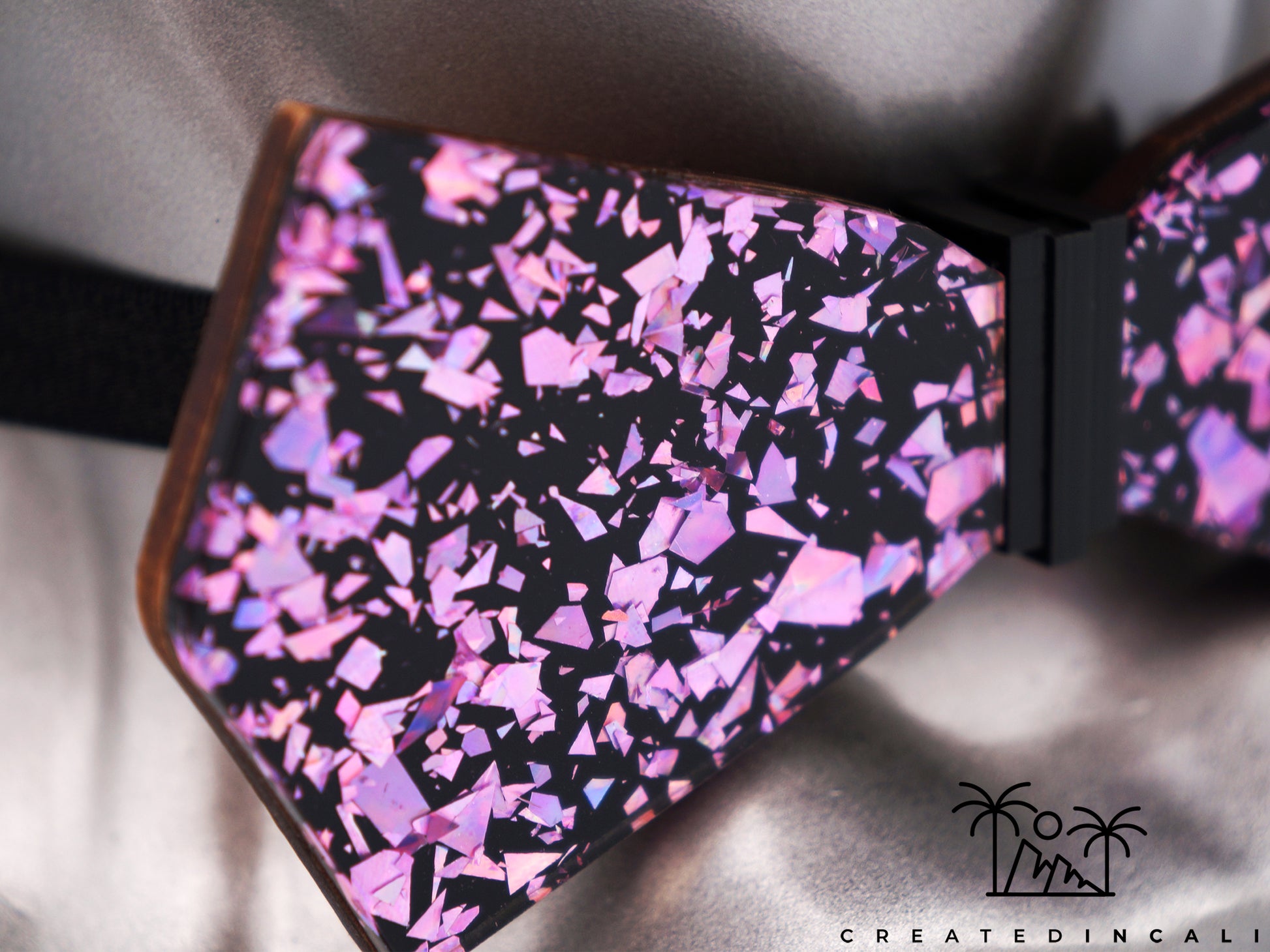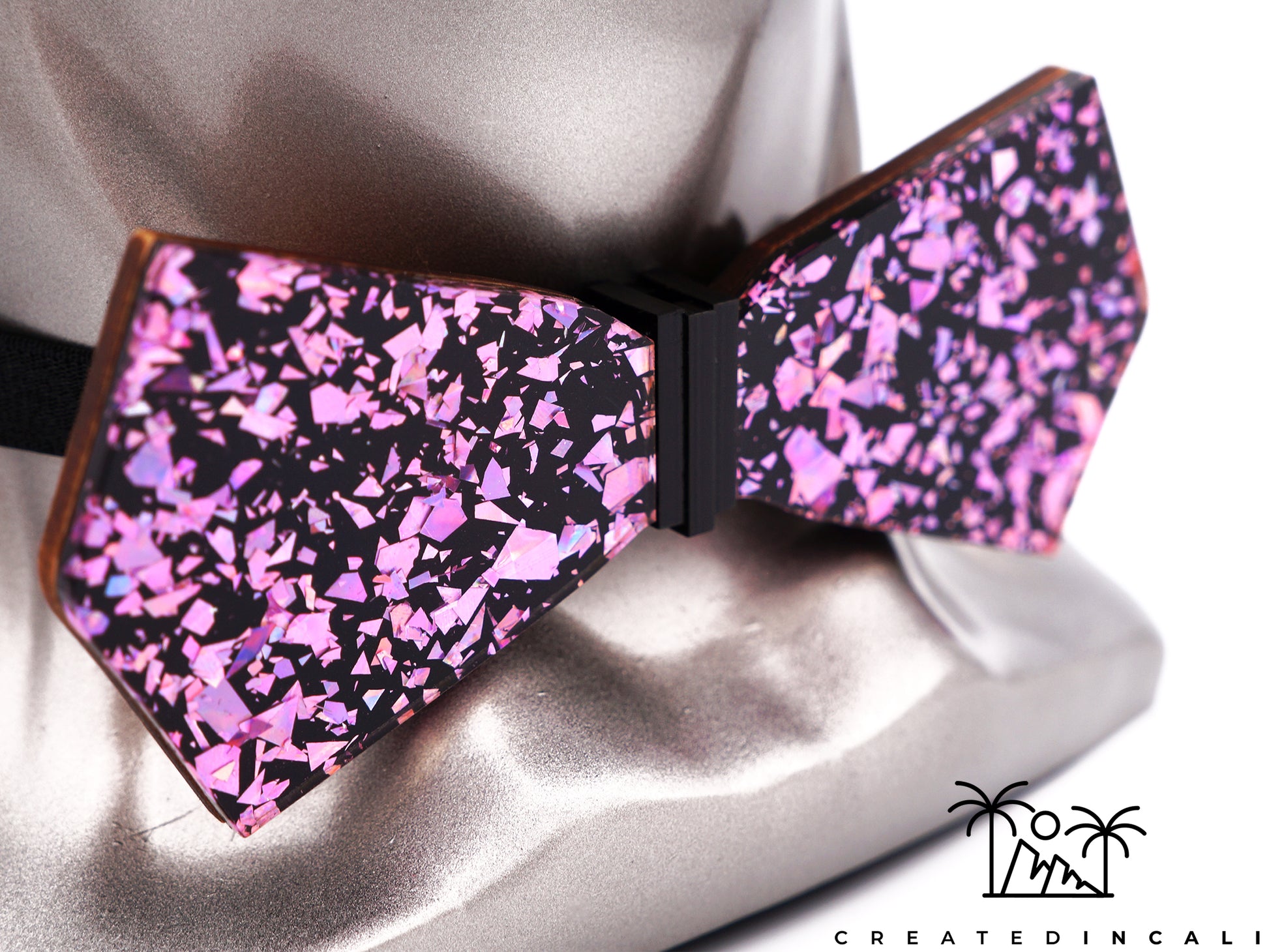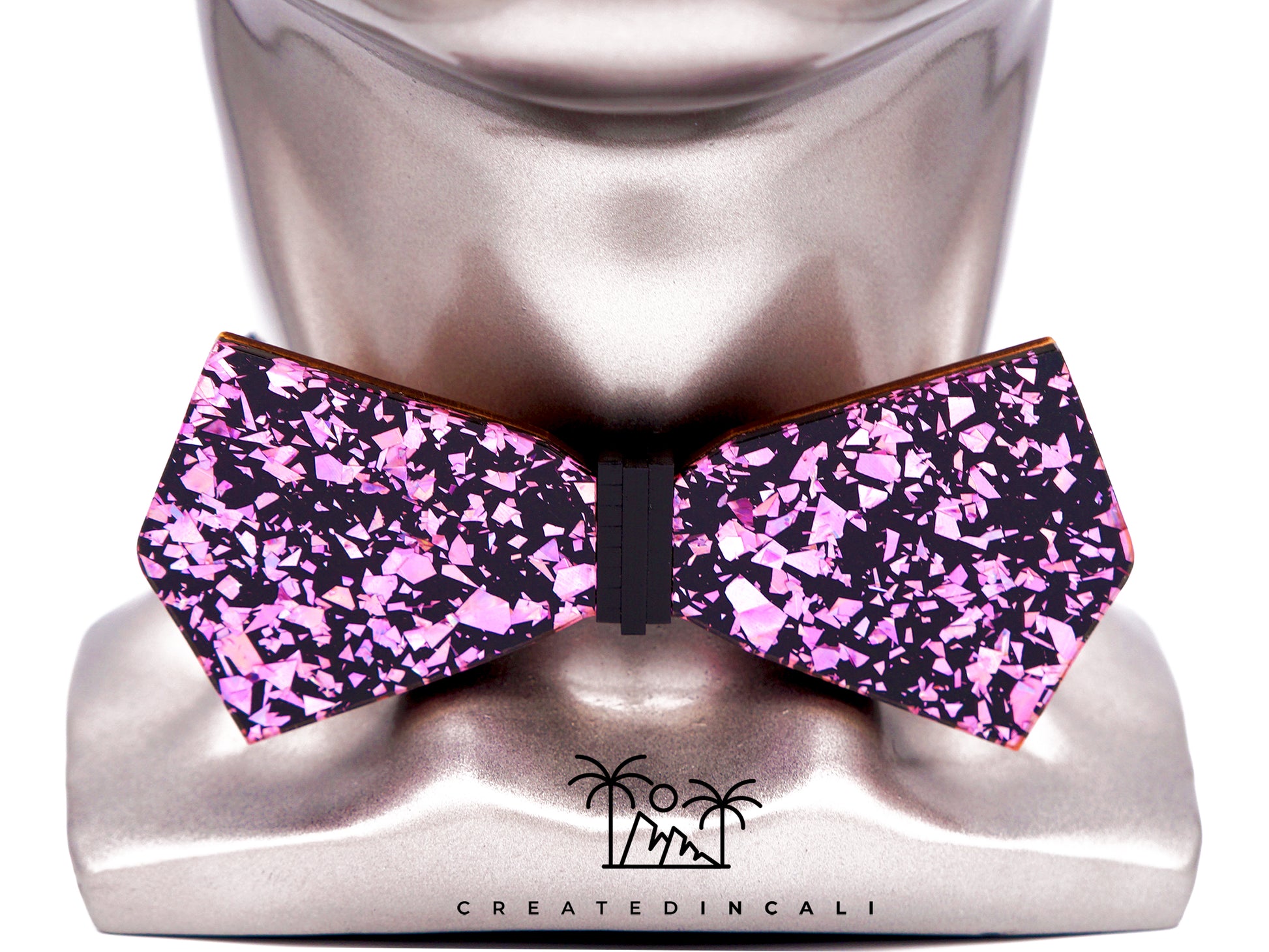 Handcrafted with meticulous precision, this bowtie boasts a sleek black surface adorned with radiant rose colored flakes, ensuring you stand out in any crowd.