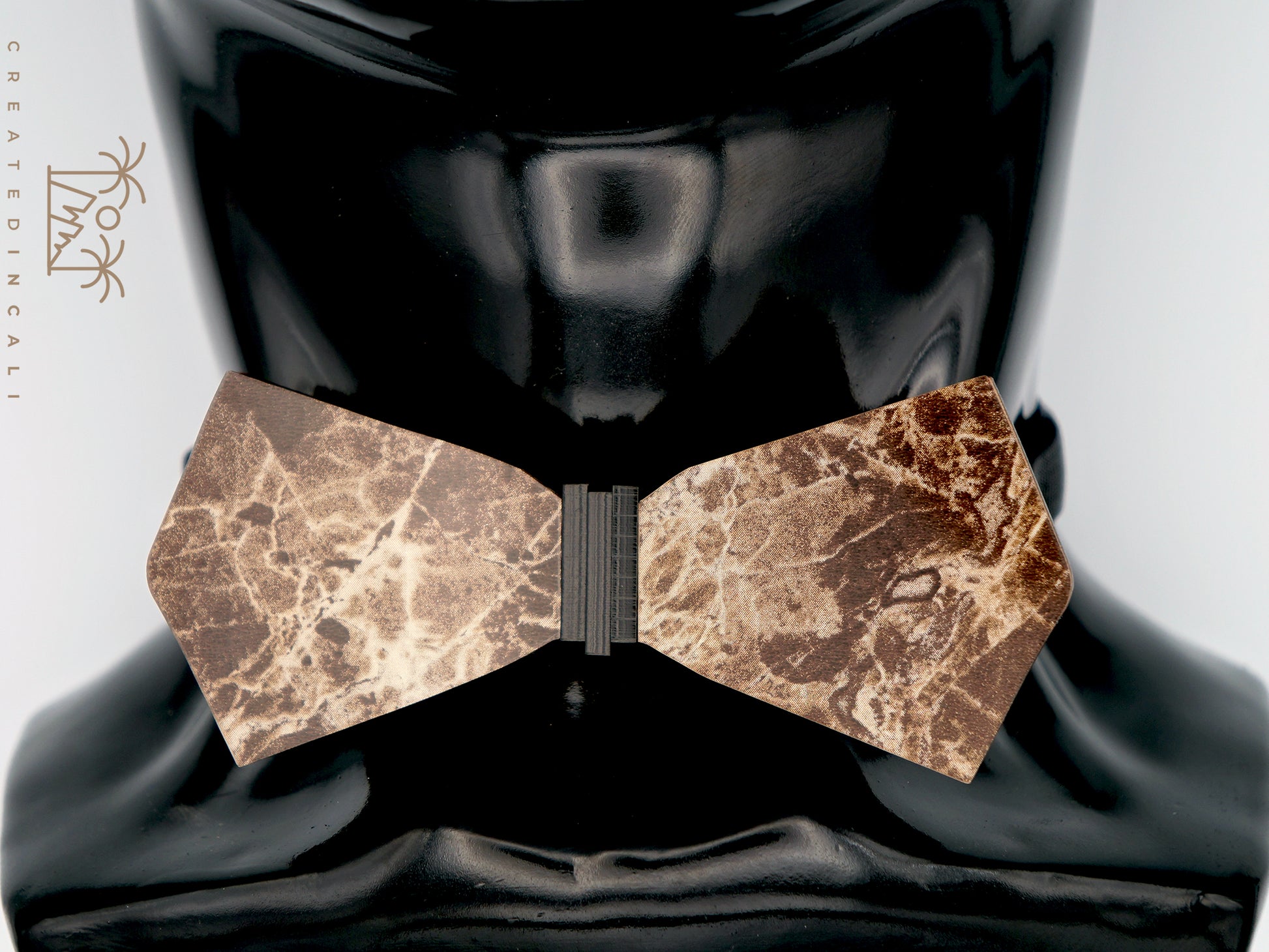 Crafted with precision, this bowtie boasts a wooden base adorned with a stunning Dark Emperador marble pattern. This piece features a unique angled edge at either end, adding a bold touch to your outfit.