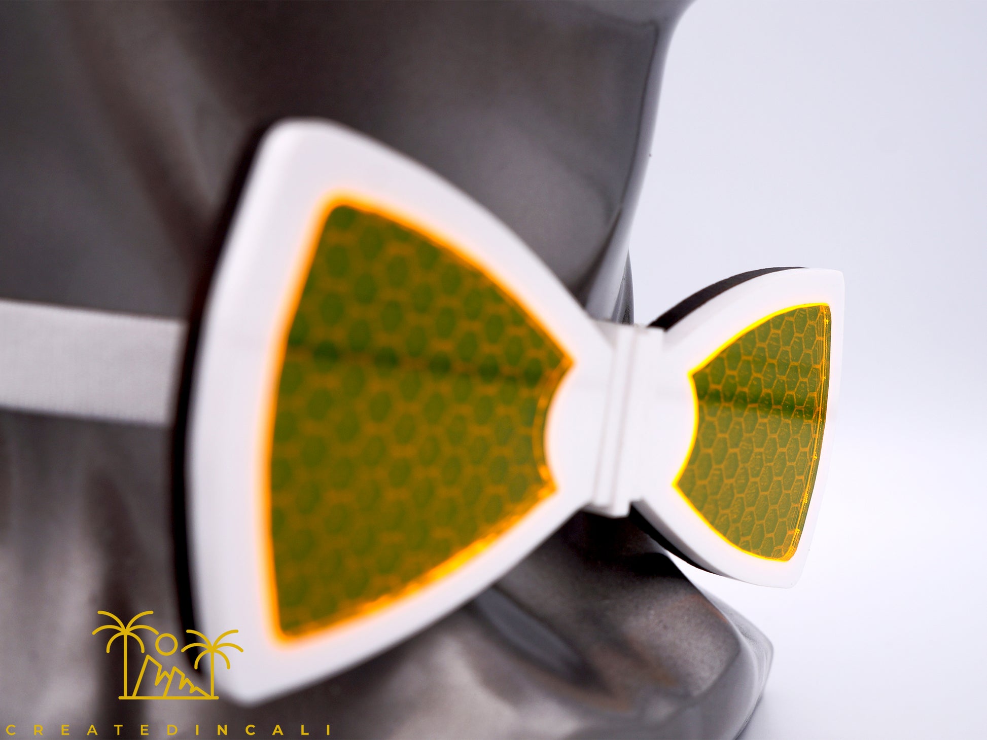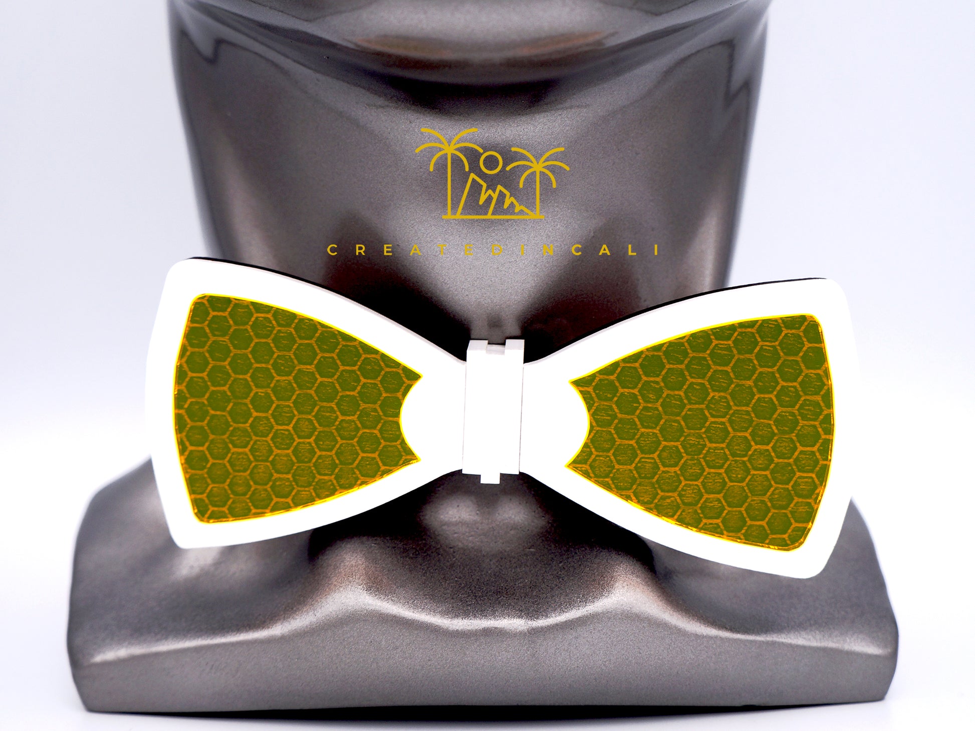 A white border frames the edge of the bowtie, which also features a distinctive honeycomb pattern carved into the walnut wood underneath. Captivating fluorescent yellow windows reveal the intricate honeycomb detail beneath them.